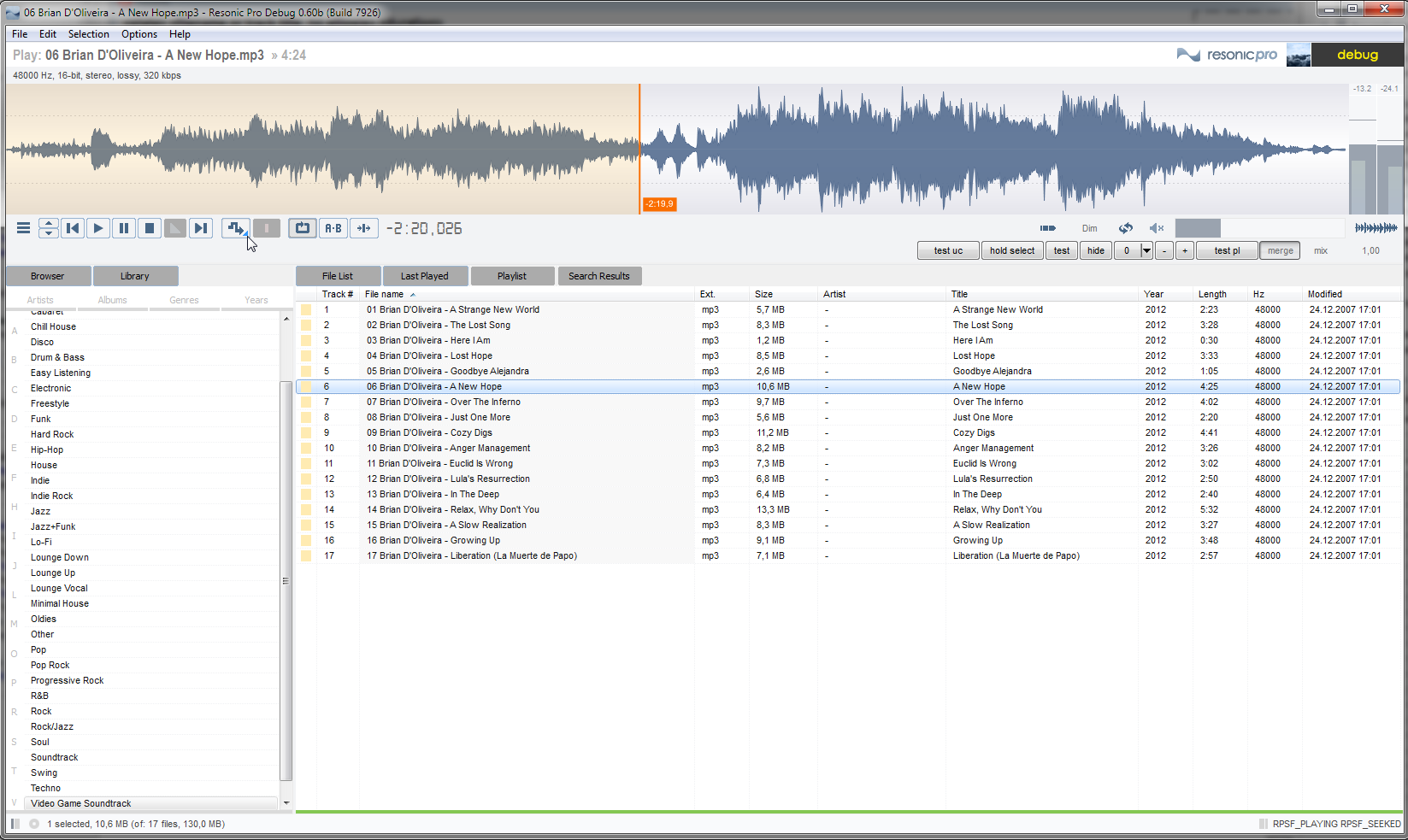 In this screenshot you can see the first two modules, analyzer and level meter in their default placements, inside an all new container floating on top of the waveform. The plain white elements and the waveform are to be reworked next, which should be pretty straight-forward now. You can also see the brand-spanking new column drag and drop and the much-improved theme support. Buttons are taking shape as well.