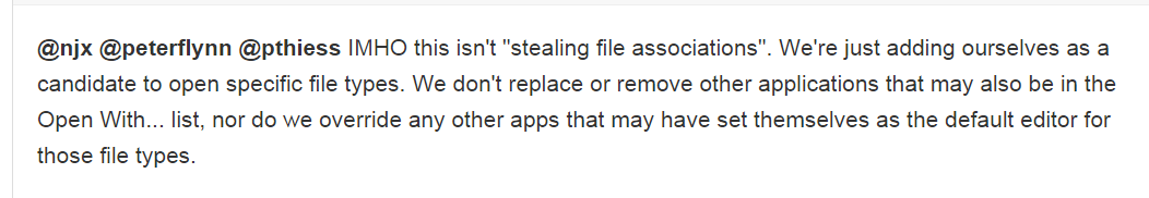 It honestly should not do that. And especially for that reason I'm using Windows Installer and the associations dialog that is built into Windows. Will have to investigate more.