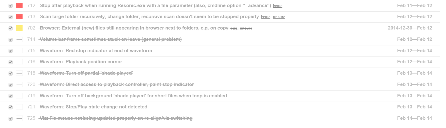 http://forums.resonic.at/viewtopic.php?f=3&t=135Blackout wrote:does anyone know what the yellow-brown colored boxes that are next to every track in the resonic list are for? not sure if I missed something, I have always assumed they are "tick" boxes for something that is yet to have the code completed? surely they just aren't nice pretty boxes?